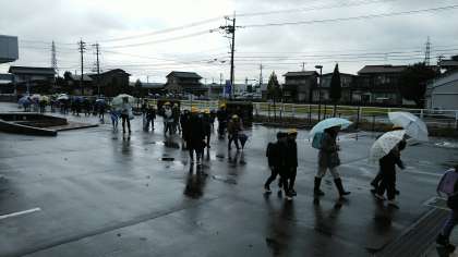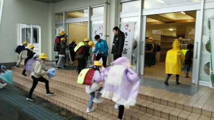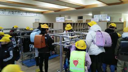 今朝の児童玄関の様子です。今日も雨です。昨日より寒い朝です。でも、子供たちは、元気です。