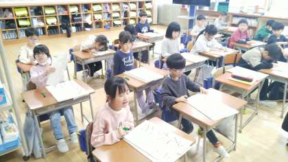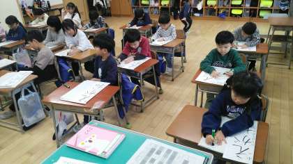 1年生の3時間目は、書写の学習でした。 書き初め大会の練習で、「えがお」という文字の練習をしていました。