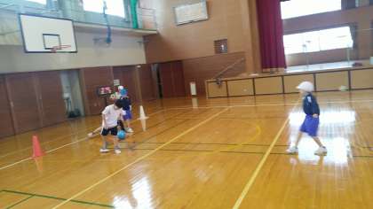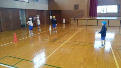 2年生の5時間目は、体育科の学習でした。体育館でサッカーのシュートの練習をしていました。