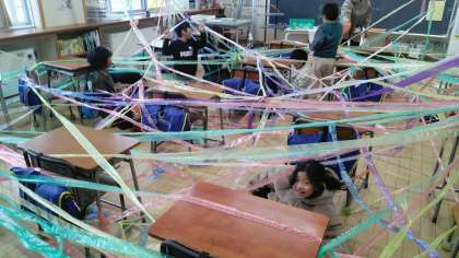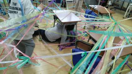5時間目の終わり頃、3年生の数名が校長室にやってきて、「3年生教室の写真を撮ってください。」というので、一緒に行ってみると、教室がすずらんテープでいっぱいになっていました。「ここの色がきれいだよ。」「面白い形はここだよ。」等、いっぱい教えてくれました。3年生のみんなが笑顔で話す様子から、造形遊びが充実していたのが伝わってきました。楽しい活動をよかったですね。
