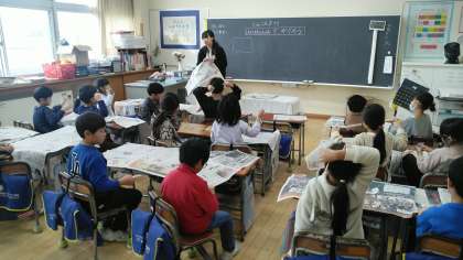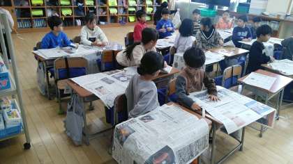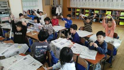 1年生の1時間目は、図画工作科の学習でした。新聞紙からほそほそ新聞を切り出していました。手で切るのですが、なかなかうまく切れないようで…。