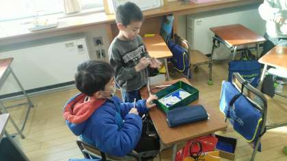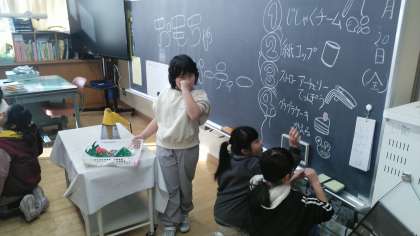 2年生は、1時間目に「おもちゃパーティー」の準備をしていました。まもなくパーティーが始まるみたいです。