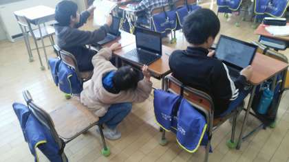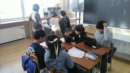 3年生の1時間目は、総合的な学習の時間でした。倉垣の自慢を4つのグループ(「倉垣飛行場」「射水線」「桜の道」「鯰鉱泉」)にわかれてまとめていました。