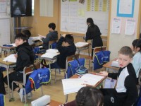 3年生は、5時間目に折り紙で何かをつくっていました。緑色の折り紙を切っていたので、きっともみの木をつくっているのだと思います。