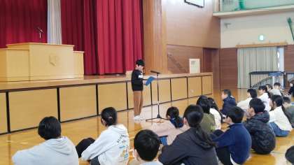 12月24日(火) 3年生 2学期がんばったこと 公開日 2024/12/24 更新日 2024/12/24 3年 終業式のあと、3年生の「2学期がんばったこと」の発表がありました。連合音楽会や表現発表会での合唱をがんばった話でした。