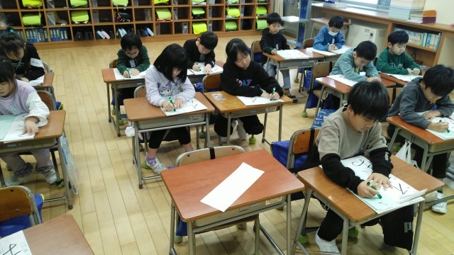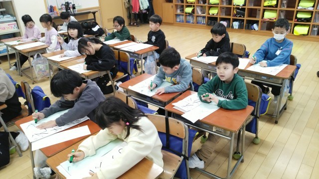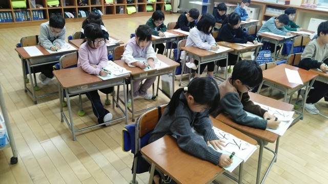 始業式のあと、教室で書き初め大会がありました。「えがお」という文字を丁寧に書きました。