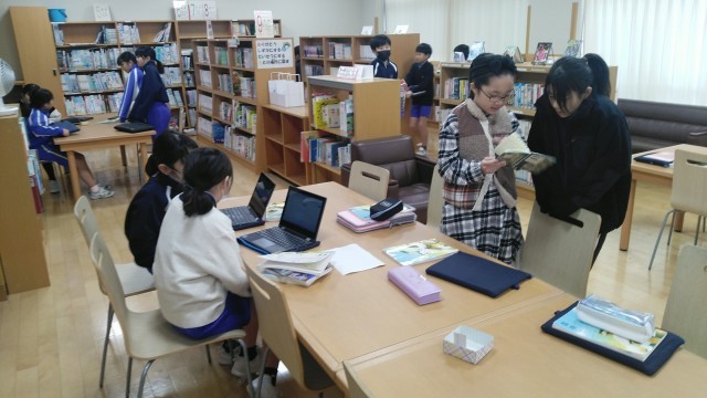 4年2組の1時間目は、国語科の学習でした。「自分だけの詩集」をつくるということで、図書室で材料集めをしていました。