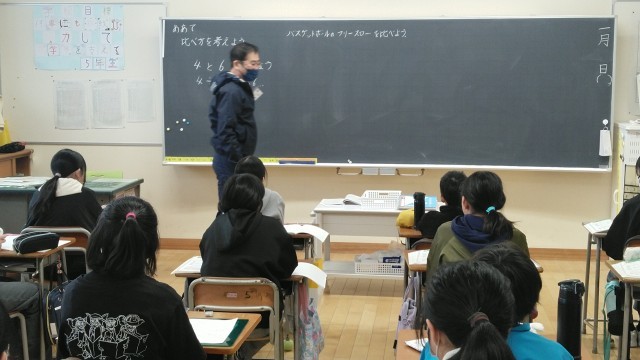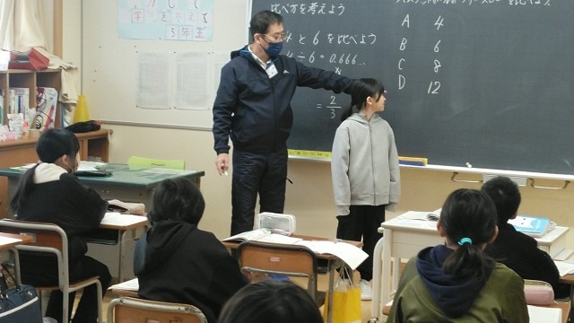 5年生の1時間目は、算数科の学習でした。「比べ方を考えよう」ということで、比べるときに必用な条件について考えていました。