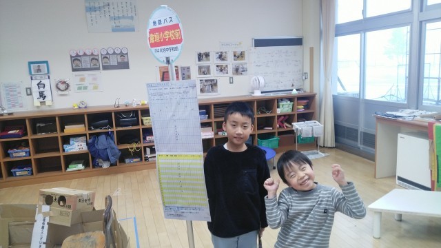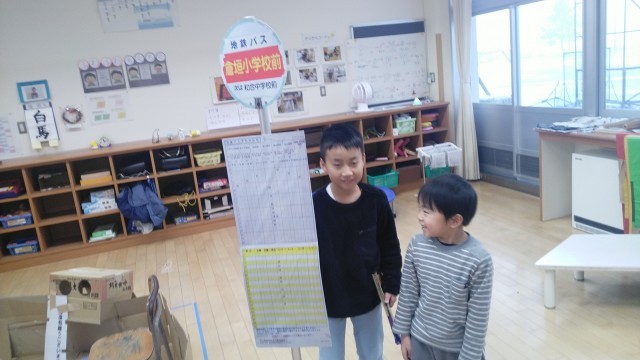 つばめ野級2組の5時間目は、バス停を使った学習でした。にっこり記念写真です。