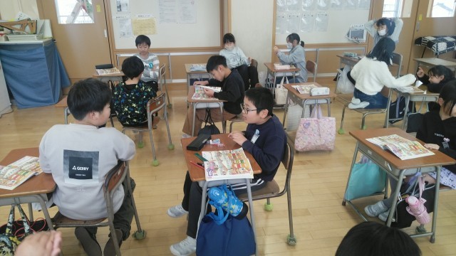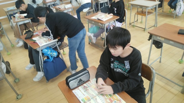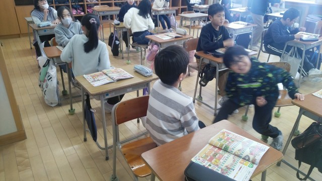 4年1組の5時間目は、外国語活動の時間でした。フルーツとベジタブルの絵を使って活動していました。