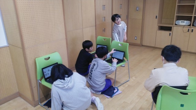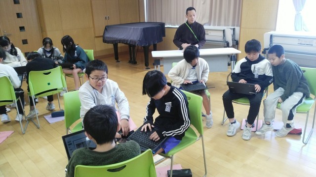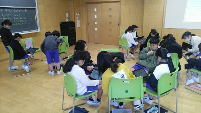 4年生の1時間目は、1組と2組合同の総合的な学習の時間でした。これまで取り組んできた「福祉」と「環境」について、発表するためのプレゼンテーションづくりに取りかかっていました。