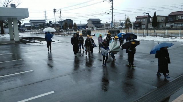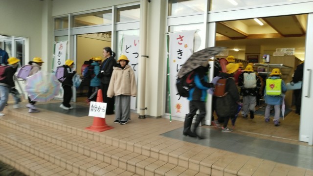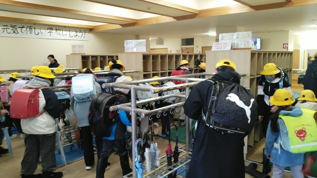 今朝の児童玄関の様子です。雨が降っていてとても寒い朝です。