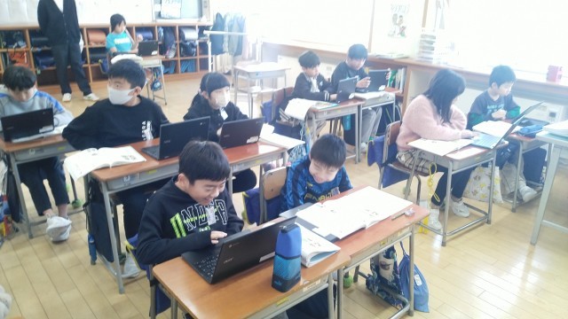 3年生の1時間目は、国語科の学習でした。4つの絵からお話を考えていました。起承転結に気を付けながらお話を考えていました。