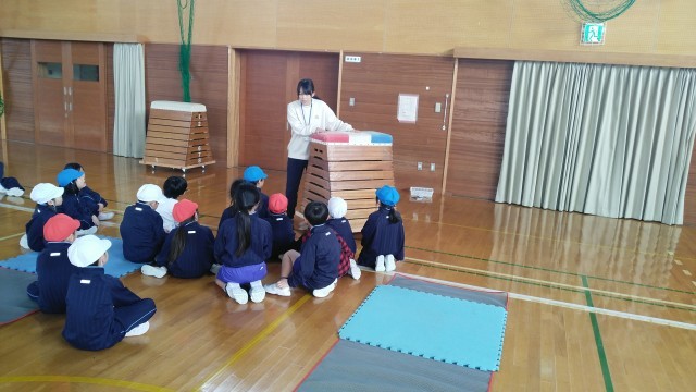 1年生の3時間目は、体育科の学習でした。体育館でとび箱の準備をしていました。
