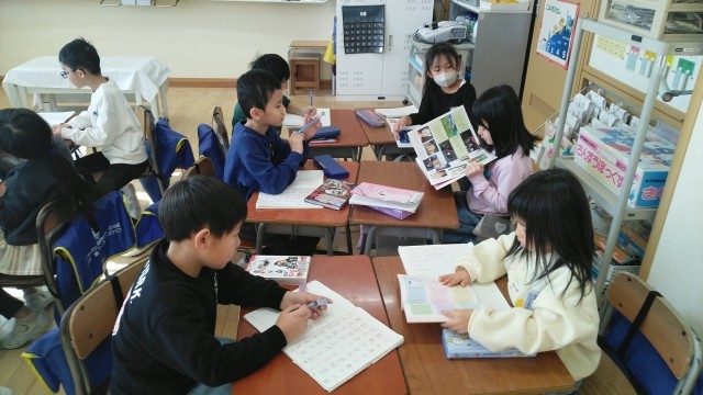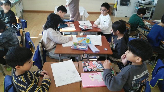 1年生の5時間目は、国語科の学習でした。「好きな本をききあおう」という学習で、友達の本の紹介を聴き合っていました。