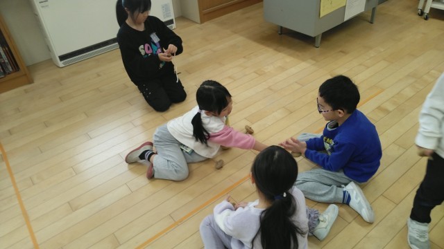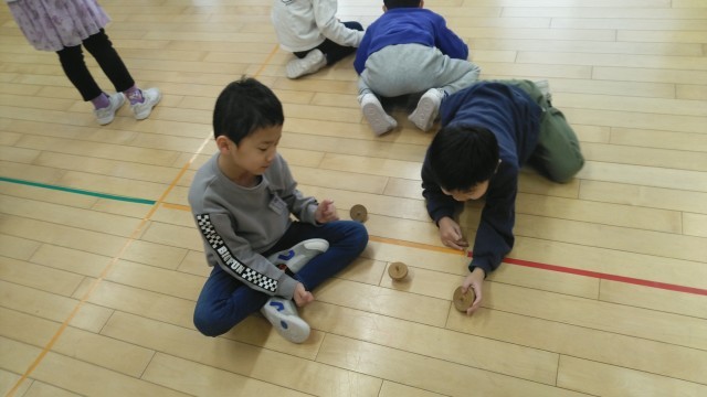 1年生の1時間目は、生活科の学習でした。こまやけん玉等、昔の遊びを楽しんでいました。でも、まだうまくできないみたいです。