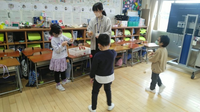 1年生の1時間目は、生活科の学習でした。こまやけん玉等、昔の遊びを楽しんでいました。でも、まだうまくできないみたいです。