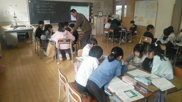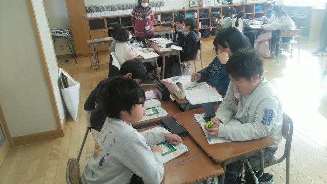 4年1組の3時間目は、算数科の学習でした。いろいろな図形の面積を出す問題を考えていました。