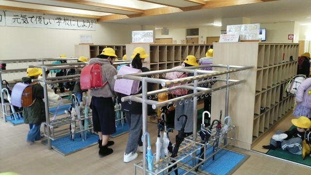 今朝の児童玄関の様子です。日はさしていませんでしたが、わりと暖かい朝です。子供たちの元気な挨拶がたくさん聞こえてきました。