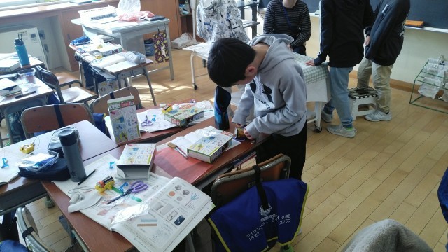 3年生の3時間目は、理科の学習でした。電気を通すものを調べる実験で、スチール缶の塗装を紙ヤスリで削ってから、豆電球が点くかどうかを確かめていました。