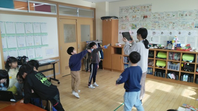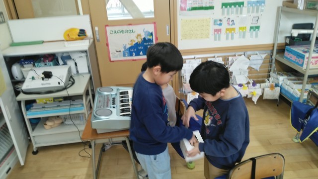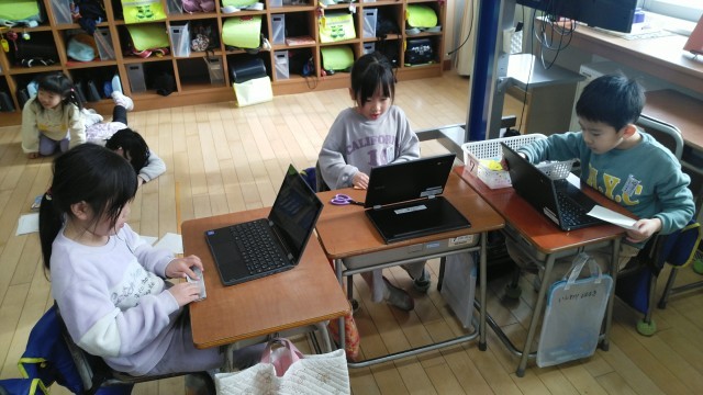 1年生の5時間目は、発表の準備をしていました。クロームブックを見ながら、たくさんの折り紙のプレゼントをつくっていました。