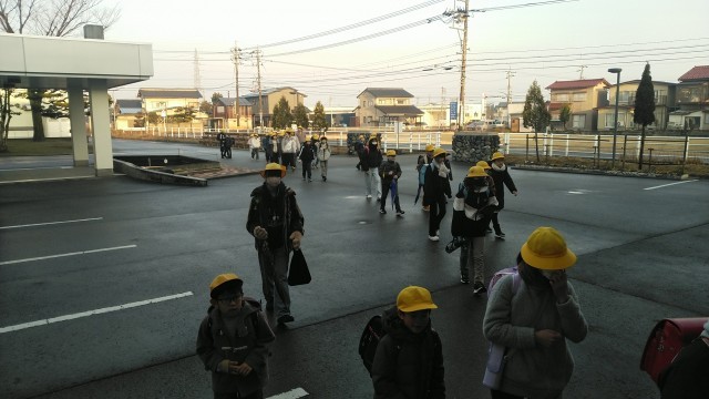 今朝の児童玄関の様子です。日差しもあり、わりと暖かい朝です。子供たちの挨拶も元気です。