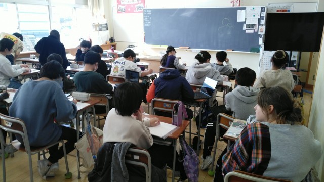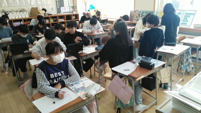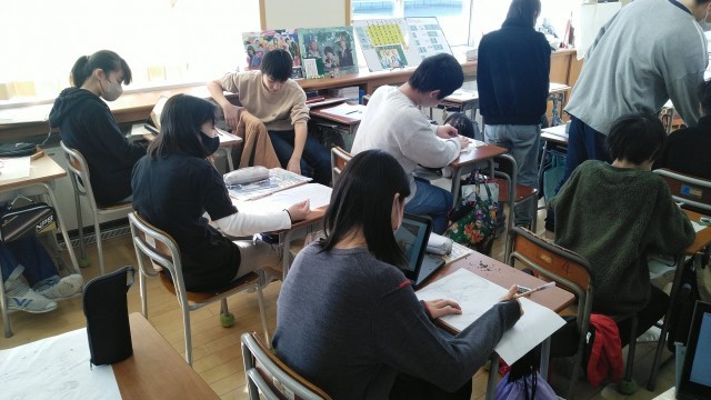 6年生の3時間目は、図画工作科の学習でした。一版多色版画の下絵を描いていました。人物を描くのがなかなか苦戦している人も多いみたいです。