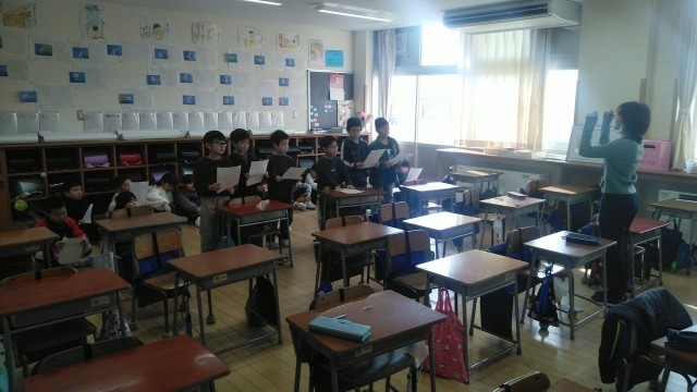 2年生の1時間目は、音楽科の学習でした。「しあわせになあれ」という曲を歌っていました。歌う人の人数がだんだん増えていきました。