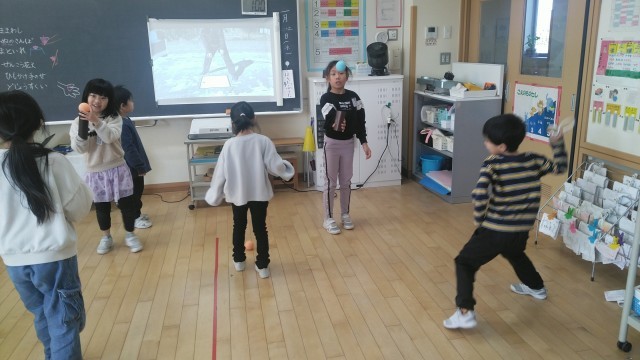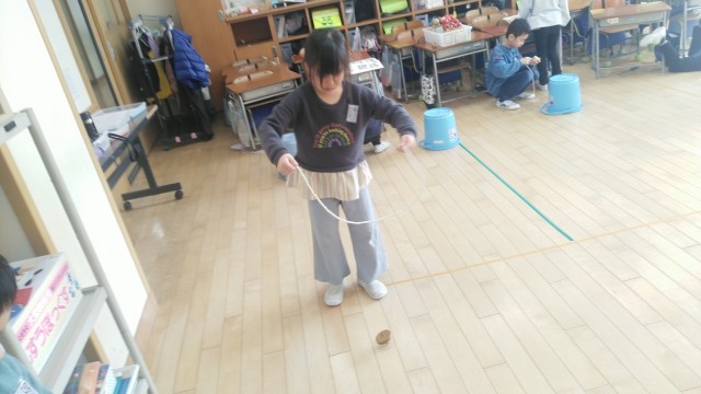 1年生の3時間目は、生活科の学習でした。昔の遊びを体験していました。なかなかうまくはできないみたいです。