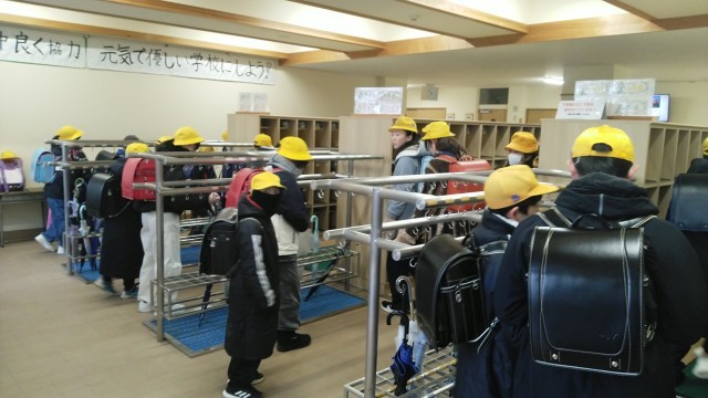 今朝の児童玄関の様子です。風がふくと少し寒い朝です。子供たちは、元気に挨拶をしていました。