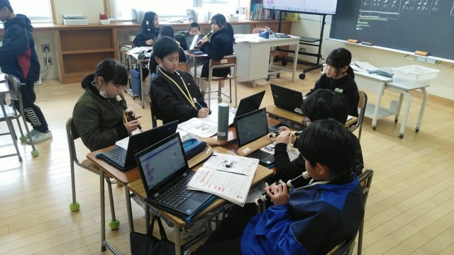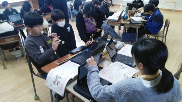 4年2組の3時間目は、音楽科の学習でした。「さくらさくら」の音階を使って、旋律をつくっていました。