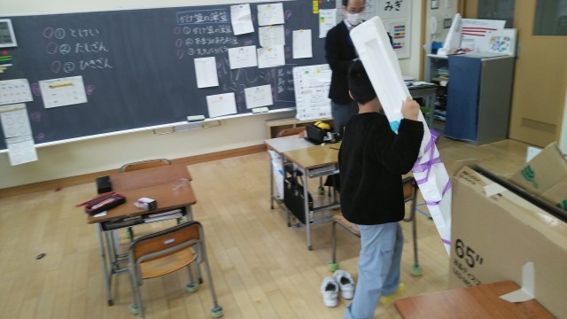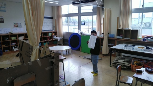 つばめ野級2組では、大きな発泡スチロールを使って何かをつくっていました。銃の様に持ったり、すずらんテープを巻いたりして活動していました。