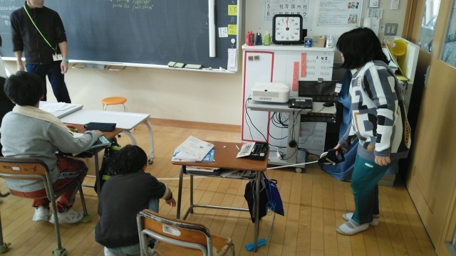 4年1組の3時間目は、算数科の学習でした。面積の単位の確認をしたあと、教室の面積を出すのに長さをはかっていました。