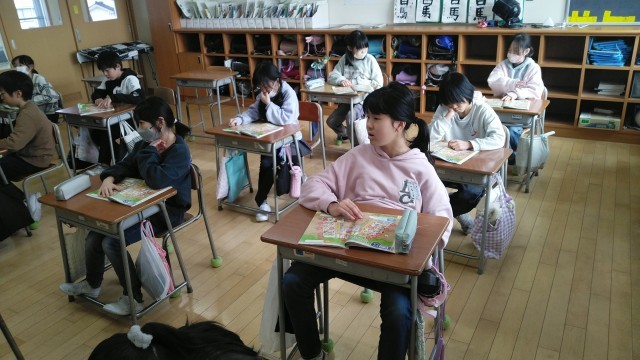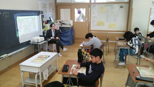 4年1組の5時間目は、外国語活動の時間でした。地図を見ながら英語の指示で進んで行くとどこの部屋に着くかという活動をしていました。