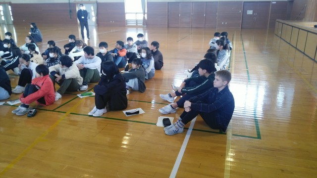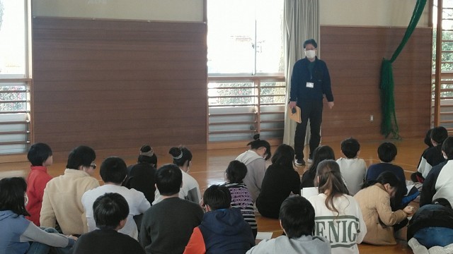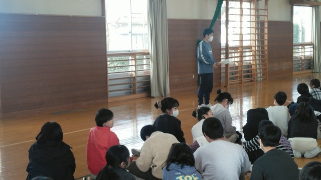 4~6年生は、お昼休みに体育館に集まってスキー学習の話を聞きました。明後日がスキー学習です。楽しく活動できるように、しっかり先生の話を聞いていました。