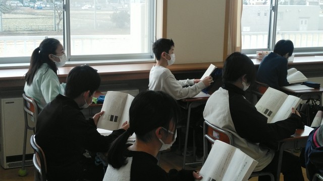 5年生の1時間目は、国語科の学習でした。「想像力のスイッチを入れよう」というお話をみんなで音読するところでした。