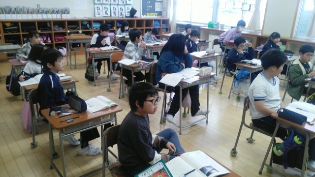 4年1組の1時間目は、国語科の学習でした。何ページの何行目に証拠の文章があるかを考えていました。