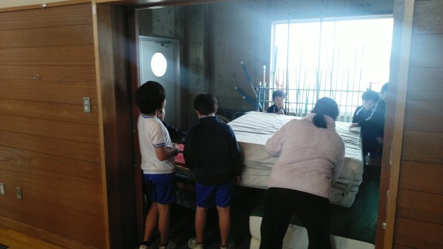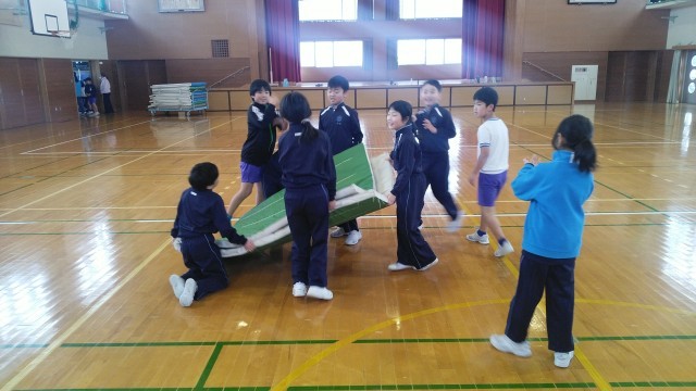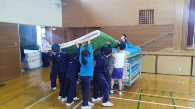 3年生の3時間目は、体育科の学習でした。ちょうど体育館でマットの片付けをしているところでした。