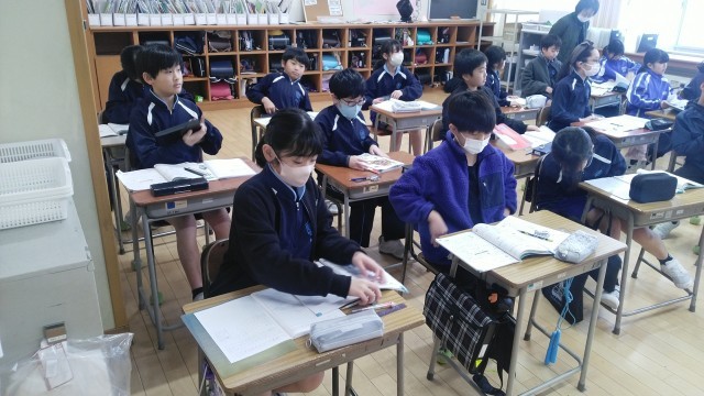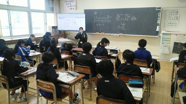 4年2組の3時間目は、算数科の学習でした。小数のかけ算の練習問題を解いていました。