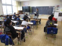 4年1組は、3時間目に掲示物を貼っていました。習字で書いた「大地」を貼っていました。