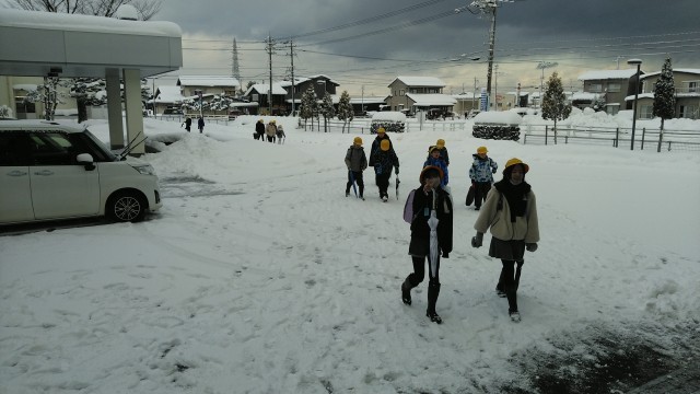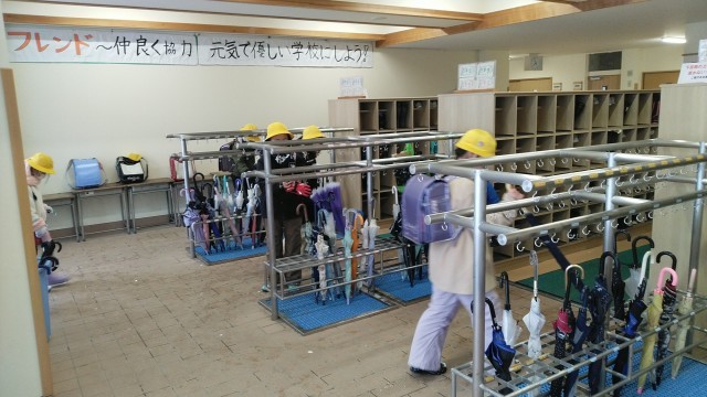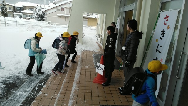今朝の児童玄関の様子です。雪は降っていませんでしたが、真っ黒な雲がある曇天です。子供たちの挨拶は元気です。