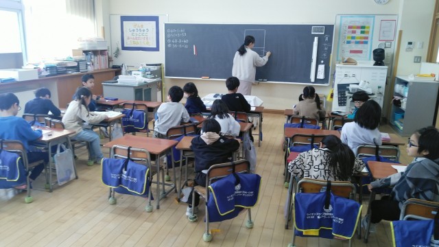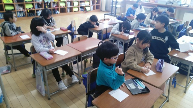 1年生の5時間目は、国語科の学習でした。「ものの名まえカード」をつくっていました。下にものの名まえを書いて、上に絵を描いてつくるカードみたいです。