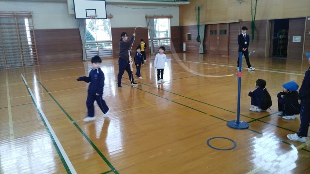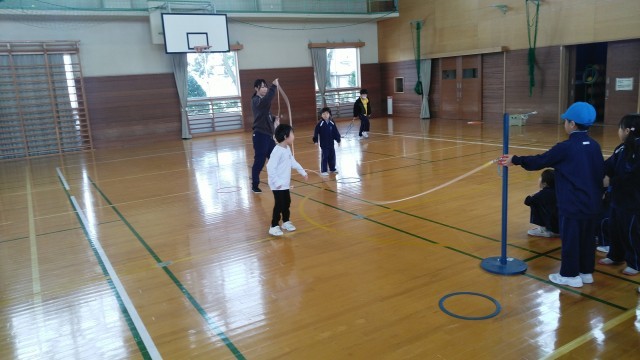 つばめ野級2組の1年生の3時間目は、体育科の学習でした。体育館で長なわとびをしていました。