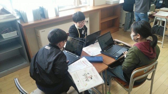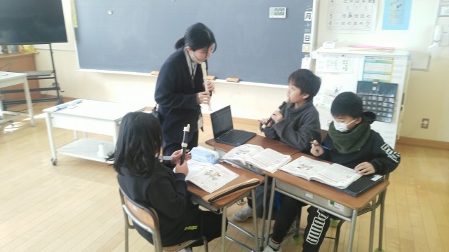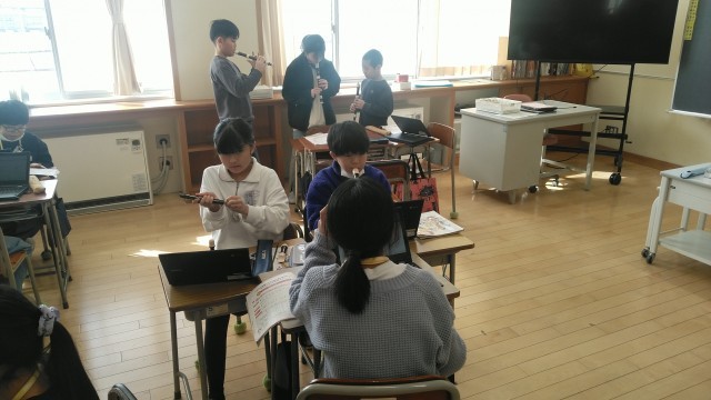 4年2組の3時間目は、音楽科の学習でした。友達のつくった「せんりつ」をグループごとにリコーダーで演奏してみていました。