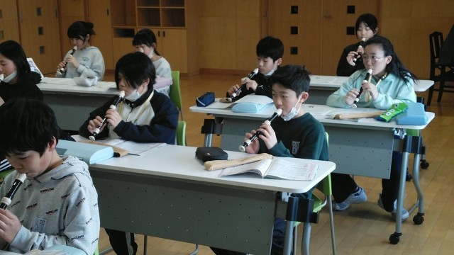 5年生の5時間目は、音楽科の学習でした。「威風堂々」という曲をリコーダーで演奏していました。