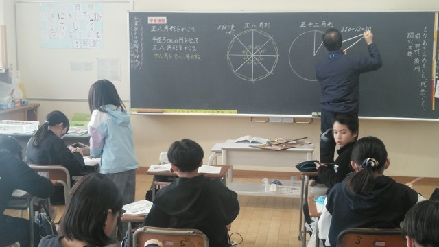 5年生の5時間目は、算数科の学習でした。「正八角形」をノートに描いていました。