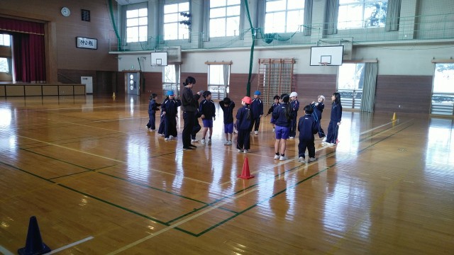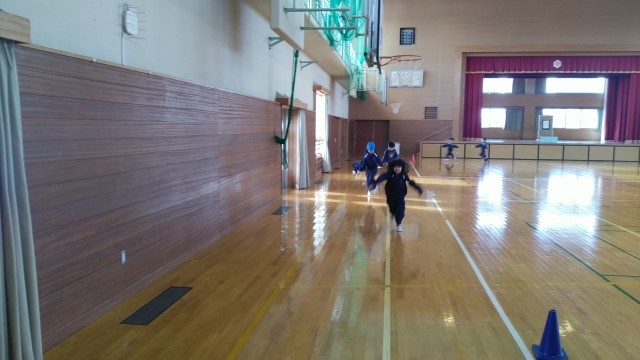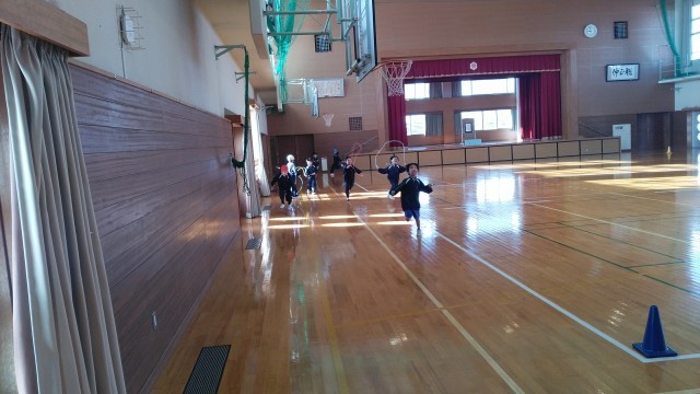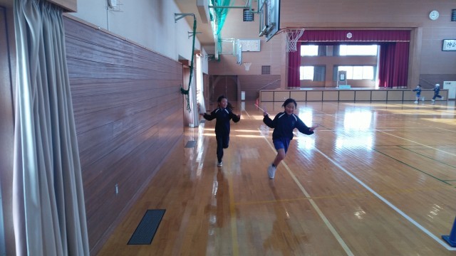 1年生の1時間目は、体育科の学習でした。体育館をなわとびを使って走っていました。