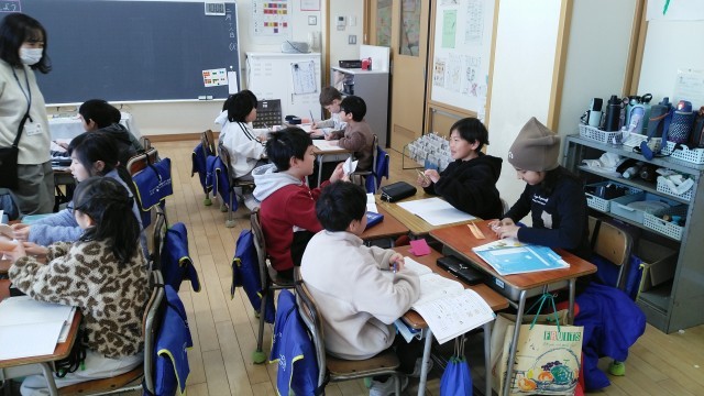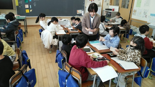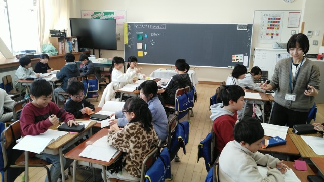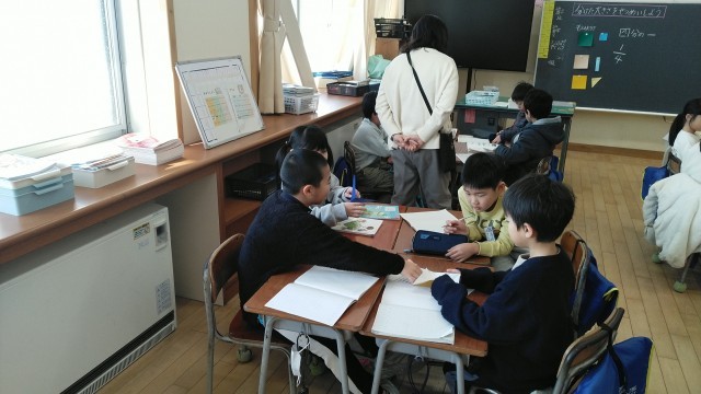 2年生の1時間目は、算数科の学習でした。「分けた大きさを説明しよう」ということで、「4分の1」の説明を考えていました。