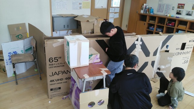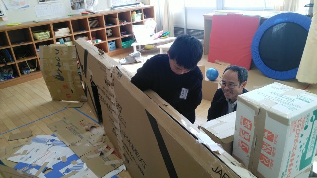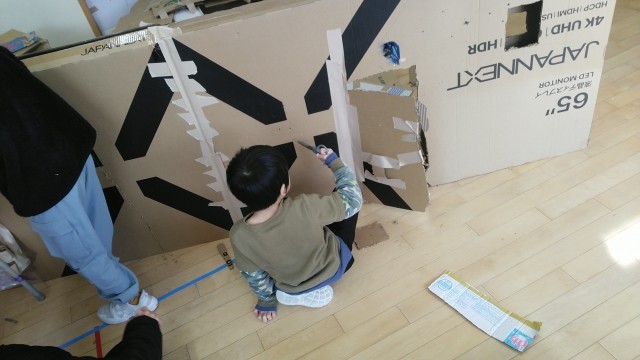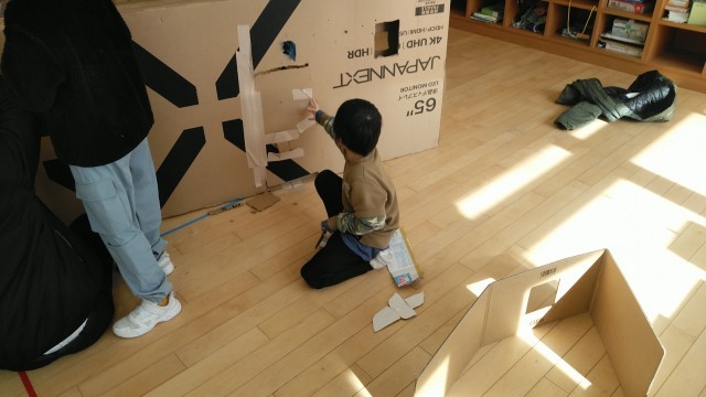 つばめ野級2組は、5時間目に新しい扉をつくっていました。段ボールハウスの壁に新しい扉をつくっていました。すごいです。