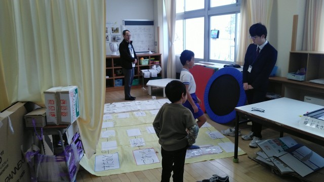 つばめ野級2組は、1時間目にすごろくをしていました。サイコロをふって、止まった目に「かくれんぼ」とかいてあったので、隠れることになりました。